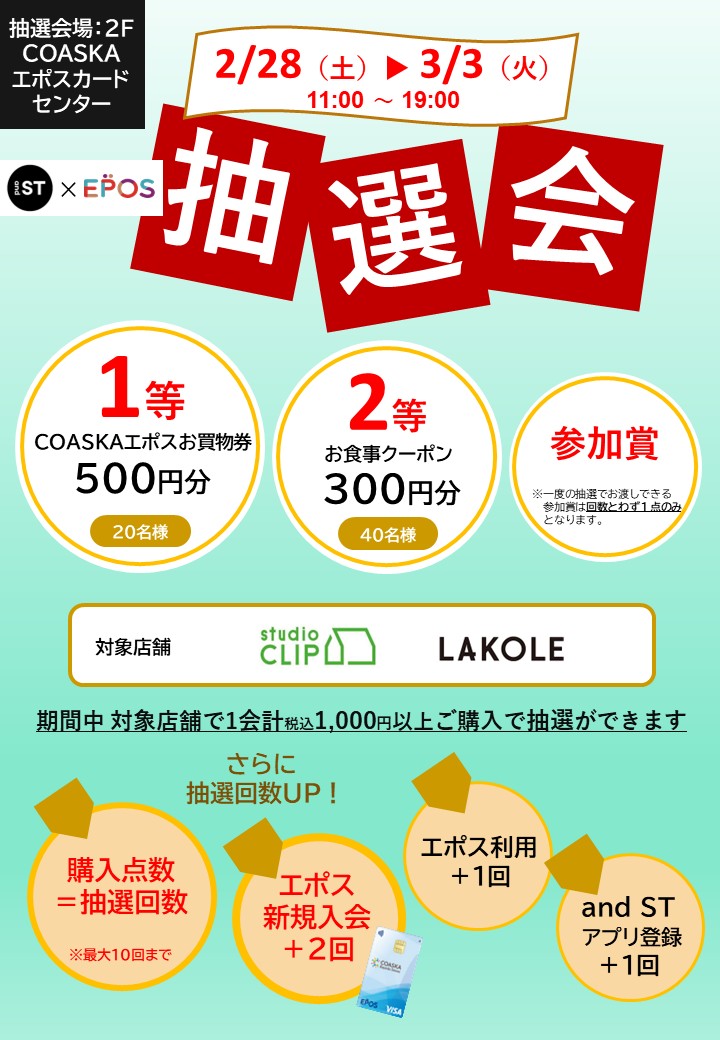 スタディオクリップ・ラコレ限定!COASKAエポスお買物券が当たる抽選会を開催!期間中、対象店舗で1会計税込1,000円以上ご購入で抽選券を進呈!2階エポスカードセンターで抽選できます。対象店舗からのご案内によるエポスカード新規ご入会でさらに2回抽選できます。